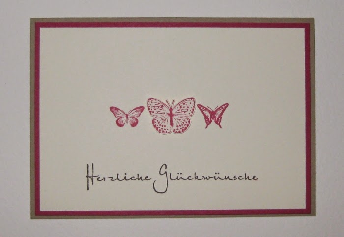 Meine Farbkombi ist Savanne, Rosenrot und Vanille Pur. Die 3 Schmetterlinge sind aus dem Stempelset „Kindness Matters“. Sie befinden sich direkt auf einem Stempelgummi. Man braucht also gar nicht groß positionieren. Den mittlersten habe ich noch einmal separat gestempelt, ausgeschnitten und mit einem Stampin Dimensionals in 3D aufgeklebt.