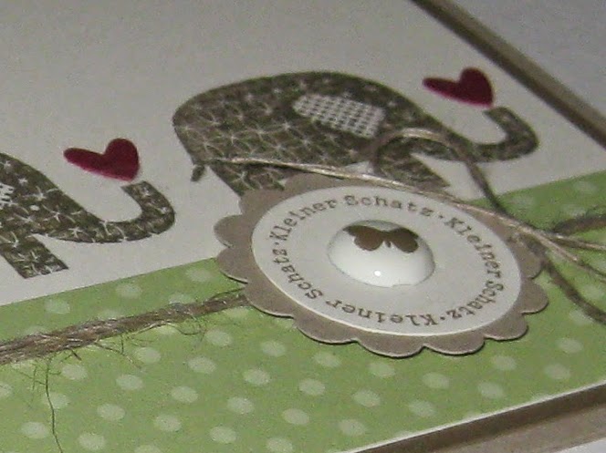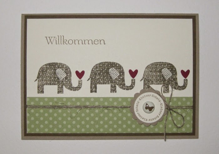 Meine Farbkombination ist Savanne, Wildleder, Wasabigrün und Vanille Pur. Dieses Mal habe ich nur den Elefanten mit dem Stampin Write Marker in Wildleder angemalt, ohne Blume und Text.